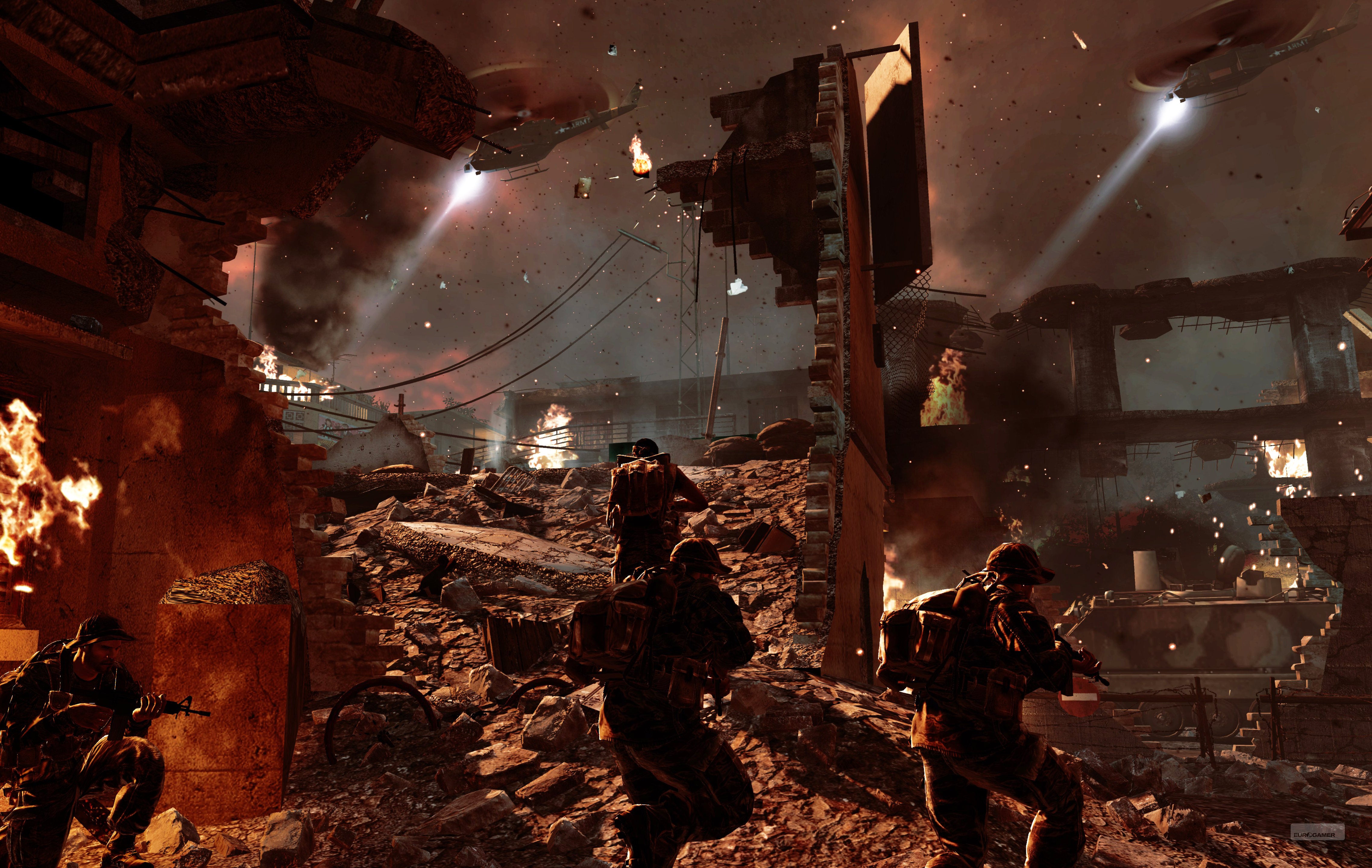 結局のところ、非常に立派です。核となるゲームプレイは、World at War エンジンの修正バージョンに基づいているため、すぐに慣れることができます。コントロールはカスタマイズ可能で、直感的なターゲットロックが復活したため、スナイパーライフルでのクイックスコープも引き続き可能です。 HUD は他の COD ゲームと非常に似ています。 2 つの注目すべき違いは、マップ上に区切られた四角形が追加されていること (チームメイトに敵の位置を知らせるのに便利) と、撃たれても画面が血でこびりつかないので、自分が何者であるかを実際に確認できることです。やってる。
