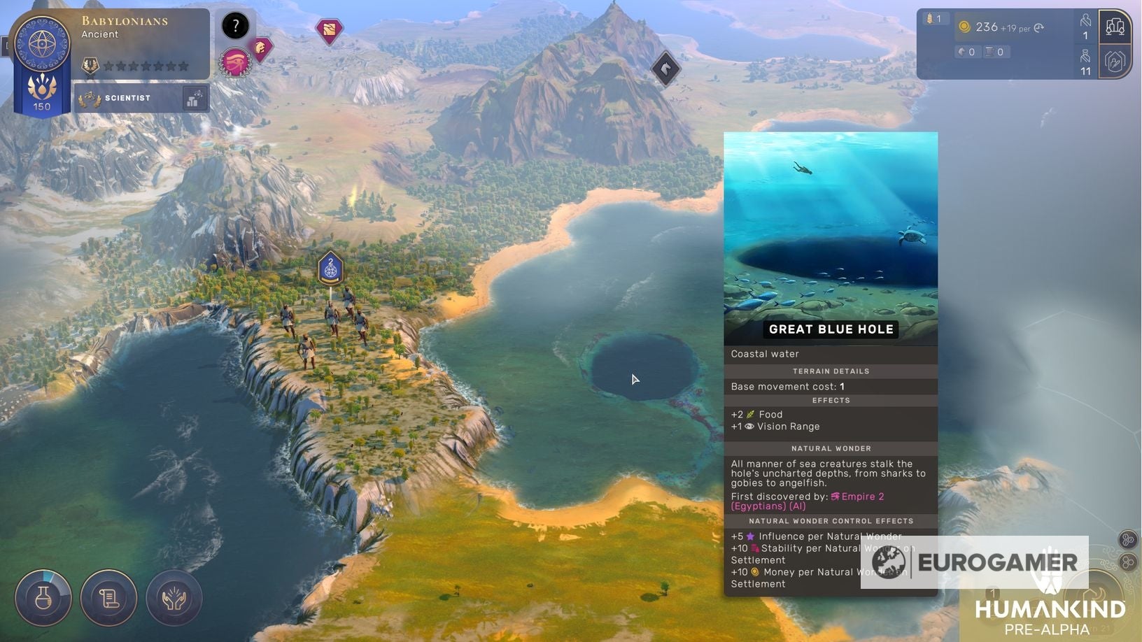 すぐに都市を見つけようとするのではなく、最初の数ターンは、ふさわしく、非常に遊牧的です。あなたは好奇心 (Civ ファンにとっては「お菓子小屋」に相当) を探して歩き回ります。これにより、知識や食料の塊が得られ、ユニットの数を増やして次の時代に進むことができます。次の時代に進み、文化を選択すると都市の設立が行われ、さらに土地の獲得と、より考慮された専門化が混合されます。
