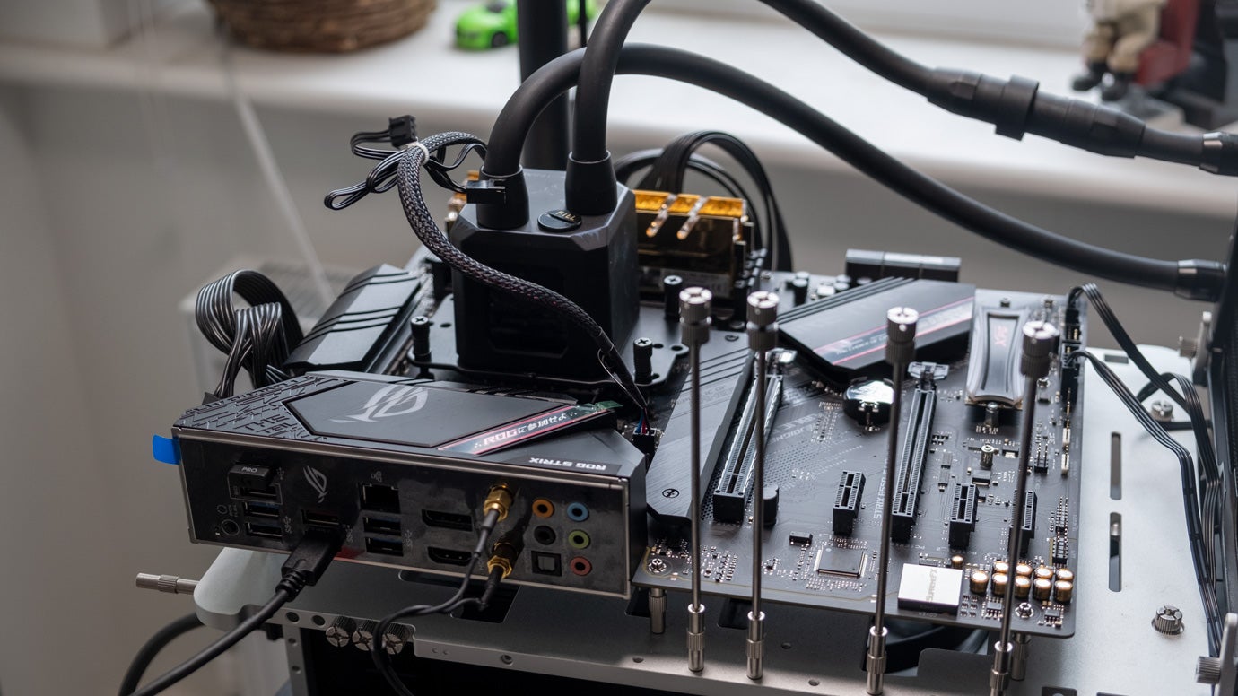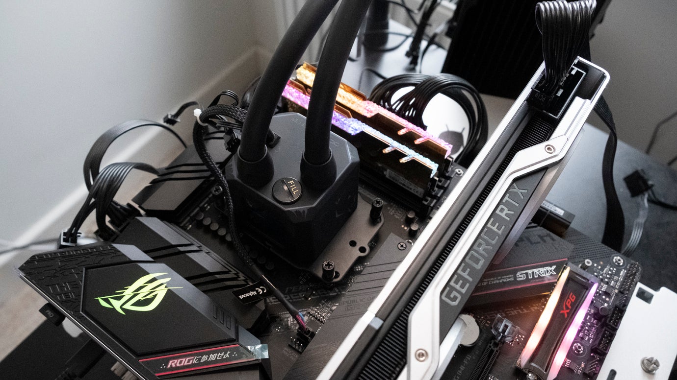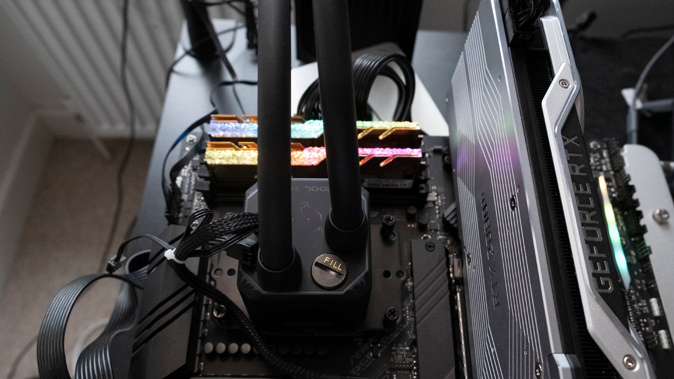 マザーボードとクーラーは変更されましたが、オープンエア テスト装置の残りの部分は同じままで、G.Skill の豪華な Trident Z Royal 3600MHz C16 RAM、850W Gamer Storm 電源、および Nvidia GeForce RTX 2080 Ti Founders Edition カードを備えています。