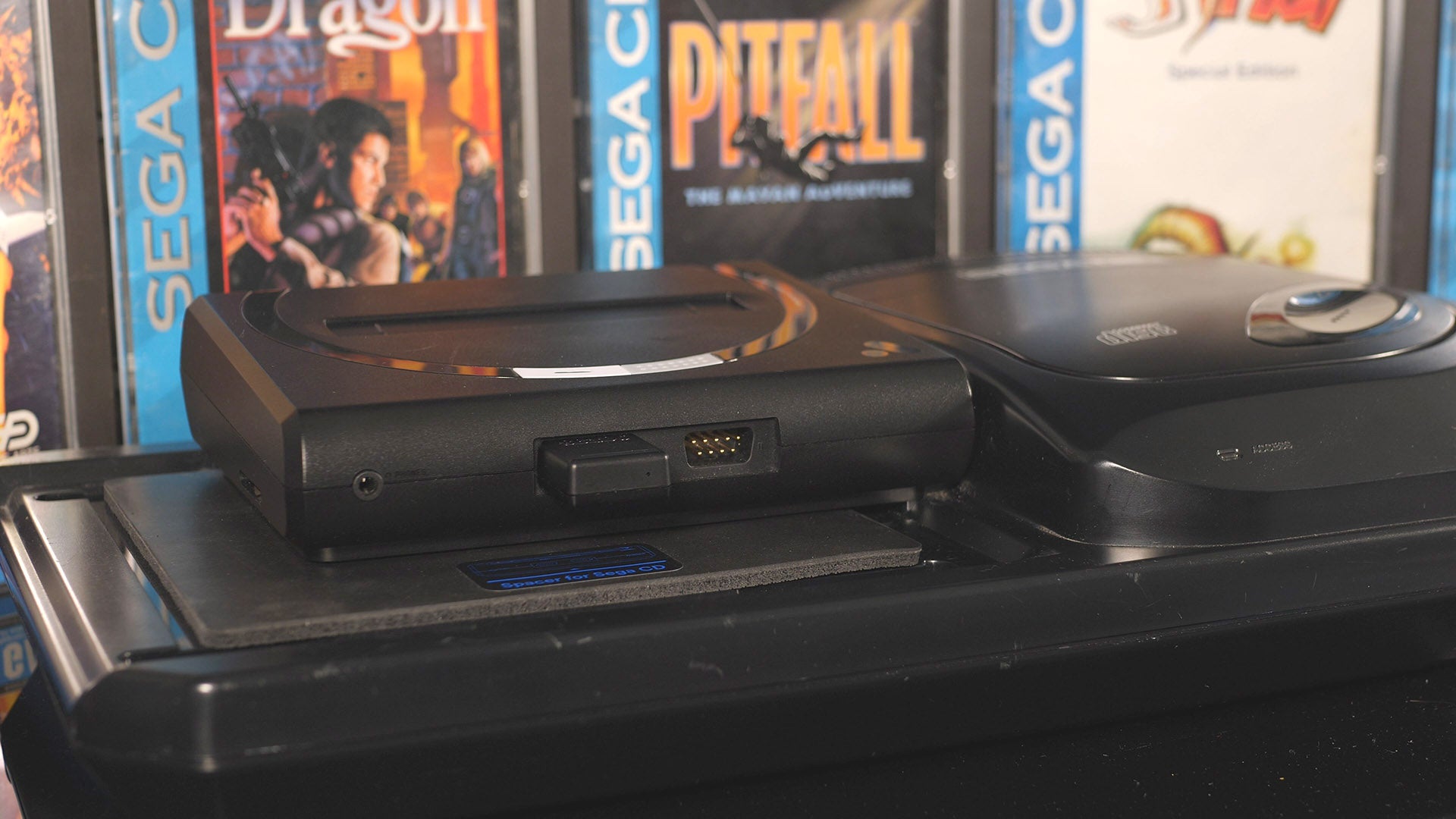Sg には、ユニットの底部にメガ CD に接続できるエッジ コネクタも含まれており、モデル 1 と 2 の両方のバージョンがサポートされています。 Sg が所定の位置に快適に収まるように小さなスペーサー パッドが付属しており、意図したとおりに機能しますが、ユニットのサイズが小さいため、見た目があまり良くありません。Sg は巨大な CD ユニットには小さすぎます。ただし、残念ながら 32X はサポートされていません。これはビデオ出力のデジタル的な性質による部分もあり、32X はメガドライブからのビデオが 32X に渡され、そこから TV に出力されるパススルーに依存しています。