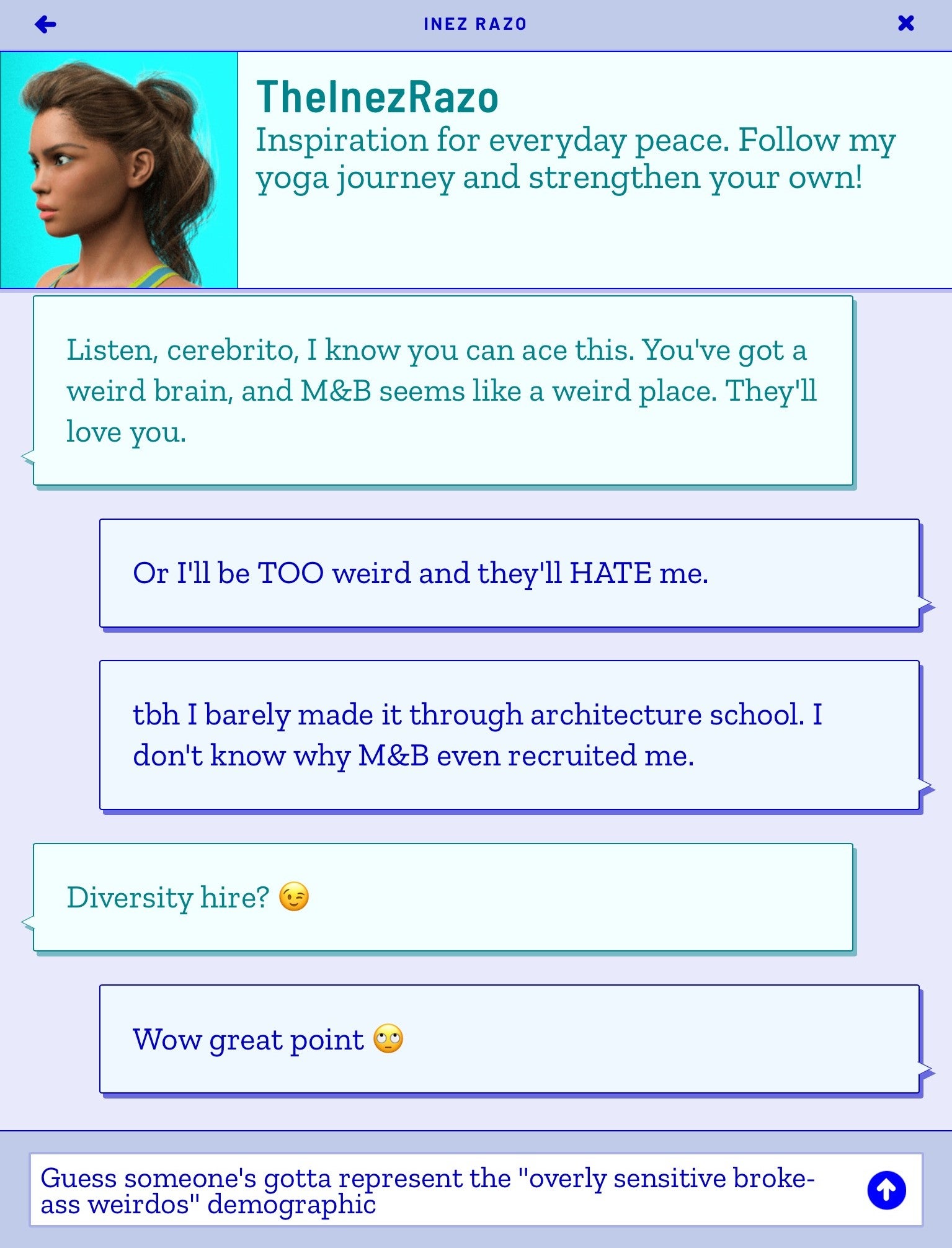 HoloVista は、この親しみやすい性質をまったく新しいレベルに引き上げます。あなたはカルメンとしてプレイし、iOS デバイスを主人公の個人電話として機能させ、メッセージやソーシャル メディアを通じて友人や家族とコミュニケーションをとります。カルメンは建築家志望で、名門だが秘密主義の設計会社でようやく出世の階段を上りました。