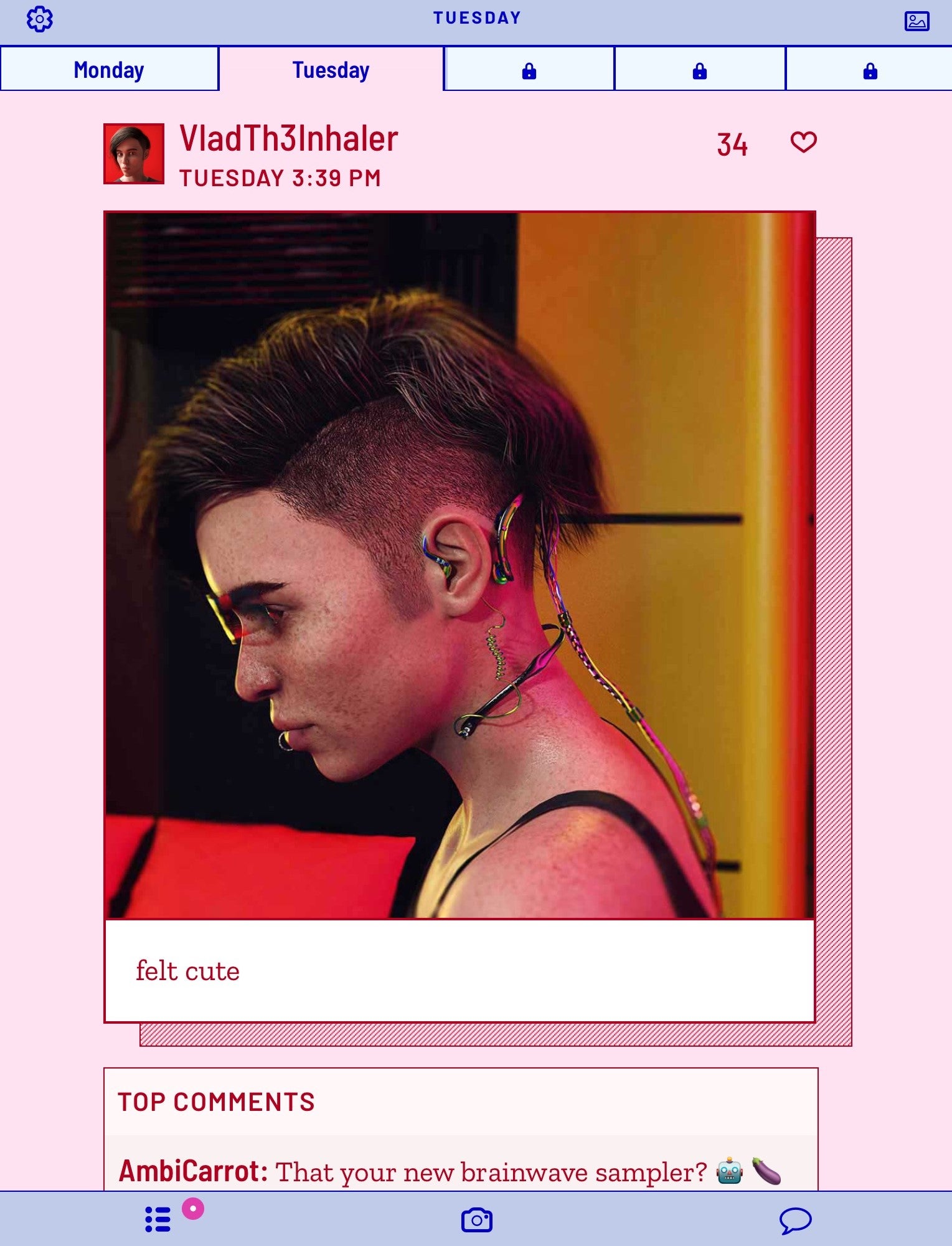明るいネオンから深いパステルカラーまで、この世界のヴェイパーウェーブの美学は信じられないほどです。ただし、ゲーム内ではあなたとあなたの言葉以外はほとんど何も動いていません。アクションは、アパートの寝室でも、就職面接を待つ豪華な玄関でも、携帯電話のカメラを使って周囲を撮影することで推進されます。これらの画像は、友人や愛する妹のイネスと受動的にまたは徹底的に共有され、議論されます。