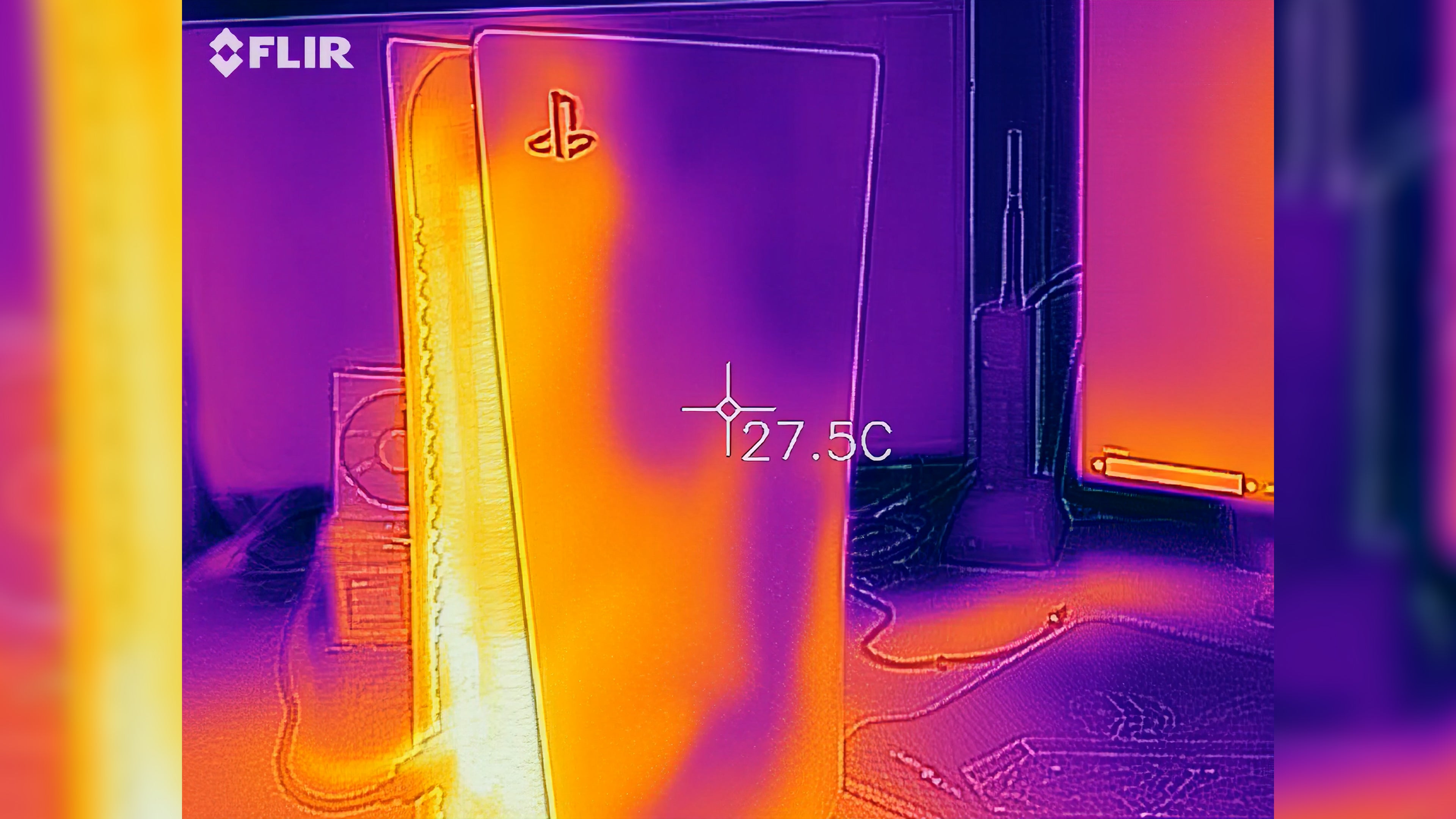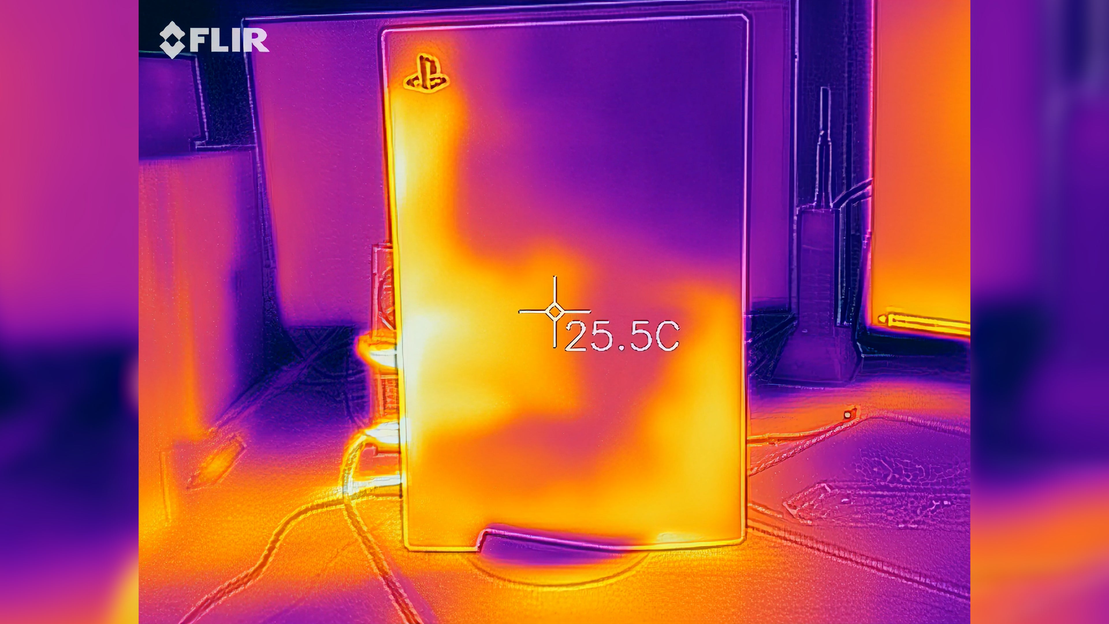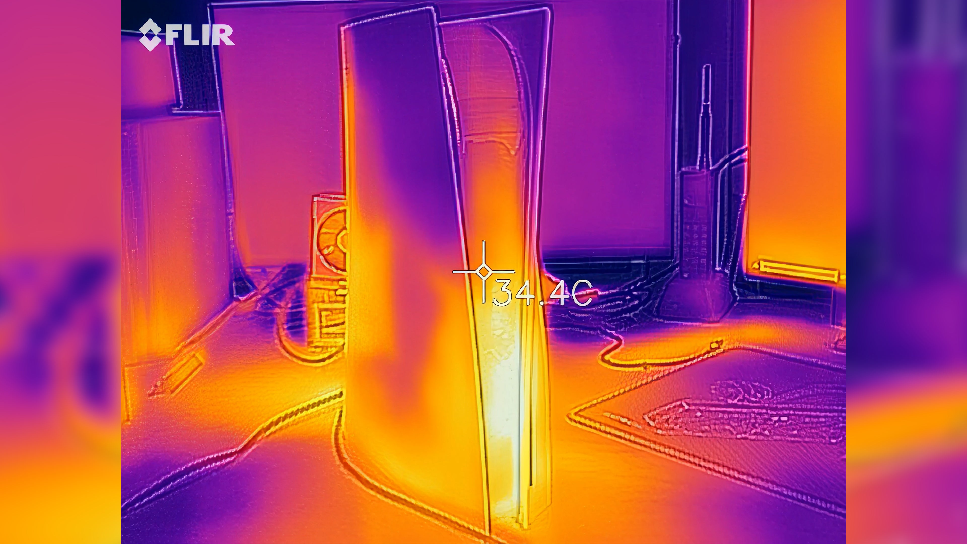 まず、シリーズ X と同様に、PlayStation 5 では騒音は基本的に問題ないと思います。本体に近づくと、わずかにファンの音が聞こえますが、リビング ルーム、オフィス、寝室などの環境では、これは周囲の騒音の中に完全に消えてしまいます。ファンの速度 (およびそれに伴うノイズ) も驚くほど安定しているようで、写真モードで Marvel’s Spider-Man: Miles Morales を使用して消費電力を可能な限り増加させ、その後コンソールを 1 時間放置しても、PlayStation 5 は引き続き安定していました。同じように涼しくて静かです。負荷がかかった状態のシステムの熱写真は、文字通り輝かしいものです。