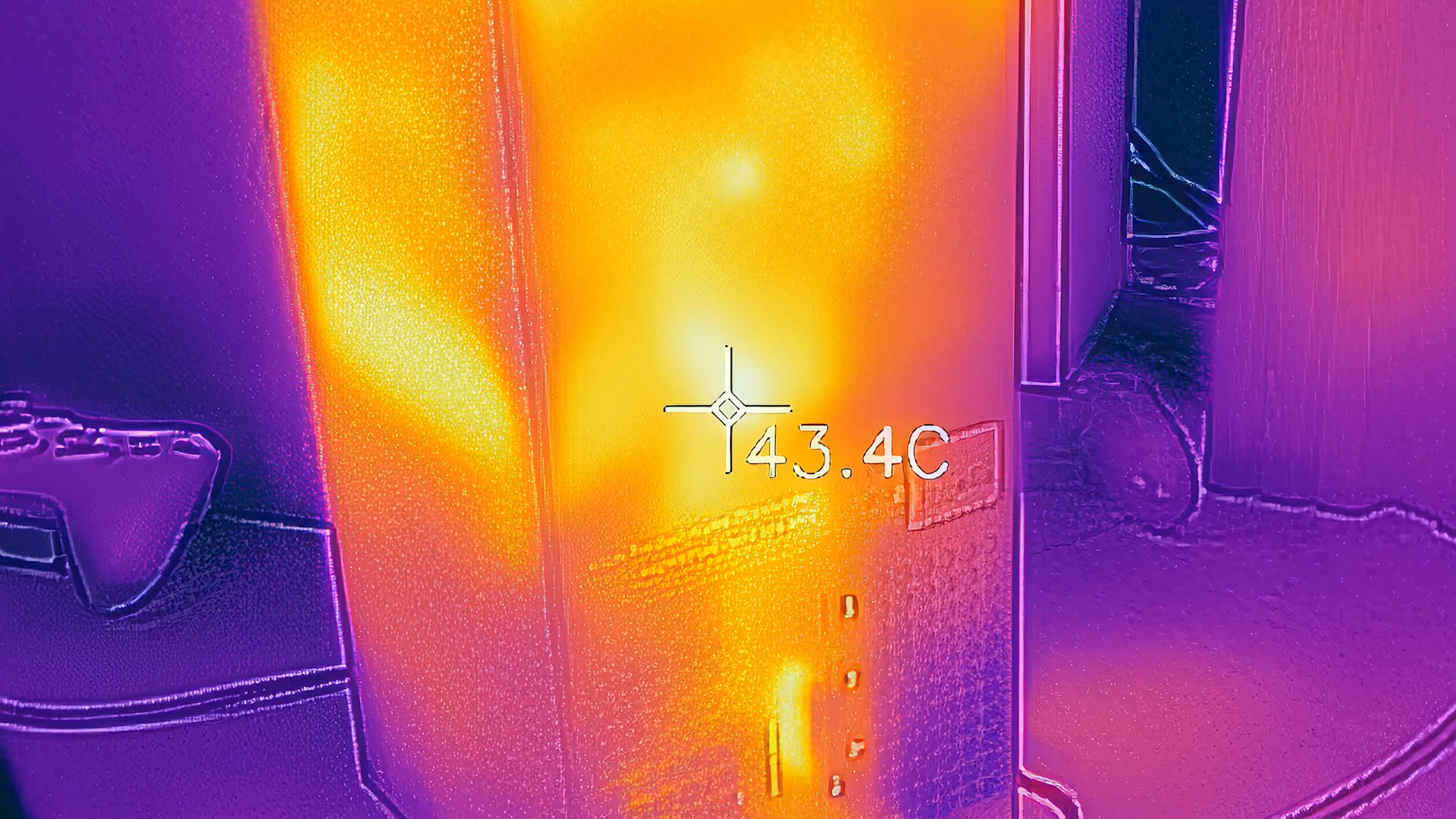 これは発売タイトルとしては良好な結果であり、世代が成熟するにつれてシステムの使用率が増加し、315W 電源のより多くの容量が必要になる可能性があると思います。しかし、Gears 5 の現時点では、熱を分析するための優れたテスト ケースが用意されているため、コンソールの描画を 200 W 以上に維持し、サーマル カメラを起動するシーンを見つけました。そこで、全体にわたる興味深い温度分布を発見しました。新しい Microsoft コンソールのスキン。