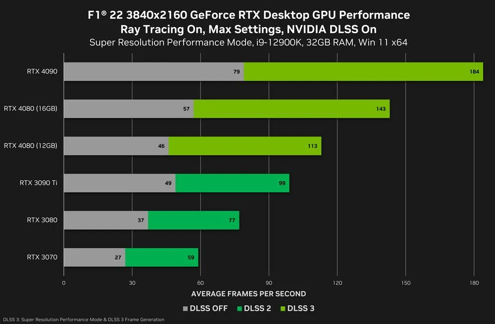 Nvidia の最新のベンチマークは役に立たない問題です。 Flight Simulator、A Plague Tale: Requiem、F1 22 の 3 つのタイトルが選ばれています。各ゲームにはさまざまなパフォーマンスの差がありますが、肝心なのは、RTX 3080 に対して想定上の 29% のコスト増加により、最低でも 11% の追加パフォーマンスが得られたということです。ネイティブ 4K 解像度 (A Plague Tale: Requiem)、F1 22 では最大 24% です。 DLSS 3 は、新しいエイダ ラブレス カードを支持する数字を強化するために使用されています。しかし、私たちはそのテクノロジーに興奮していますが、それはそうではありません。完成した記事とベンチマークでの使用は、特に利用できる DLSS 3 タイトルが少数であるため、良い動きとは言えません。 RTX 3080 12GB をどの方向から見ても、RTX 3080 の亡霊はあまりにも大きく見えます。