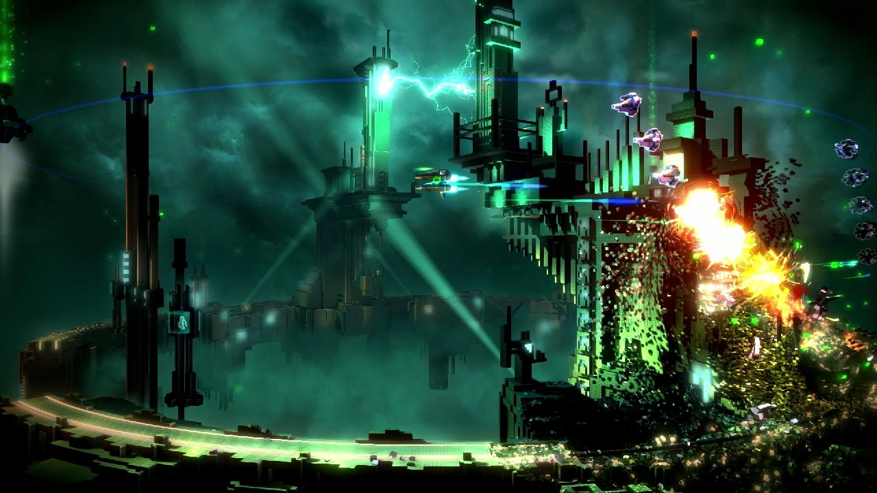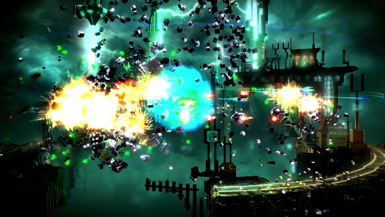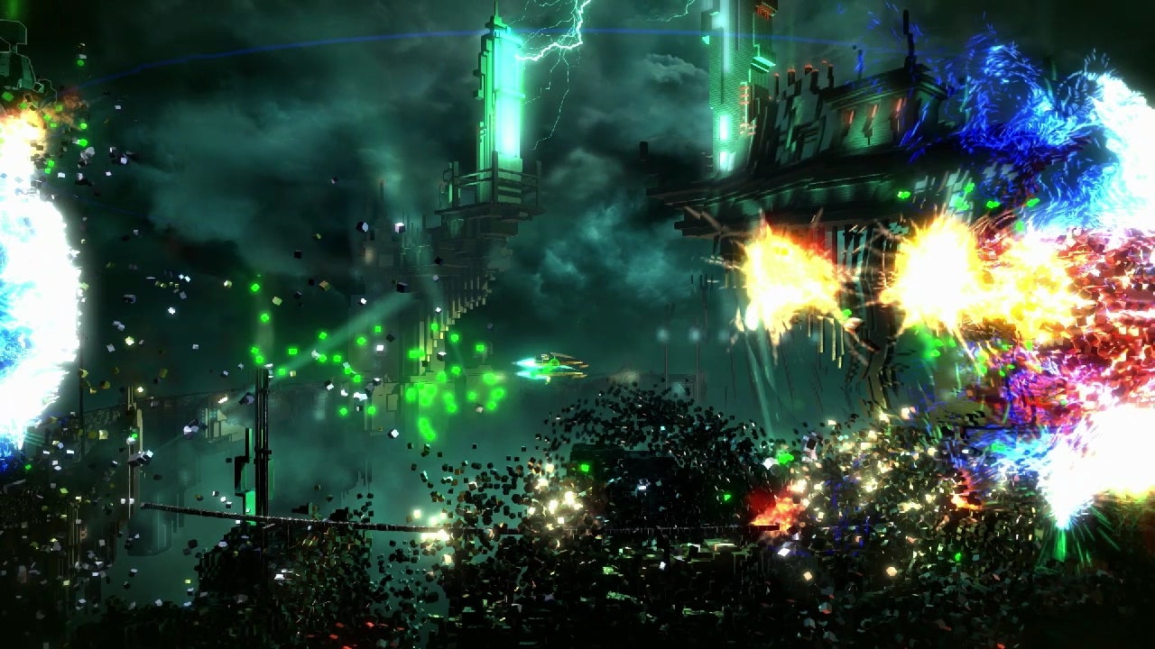 巨大な爆発、敵の波、弾丸の嵐はすべてコースにあり、この開発者に期待される画面いっぱいの花火によって支えられています。デジタル大虐殺を実現する Housemarque のアプローチは興味深いものです。環境は数十万の立方体から作成され、それぞれの立方体が GPU で加速された物理学によって個別にアニメーション化されます。