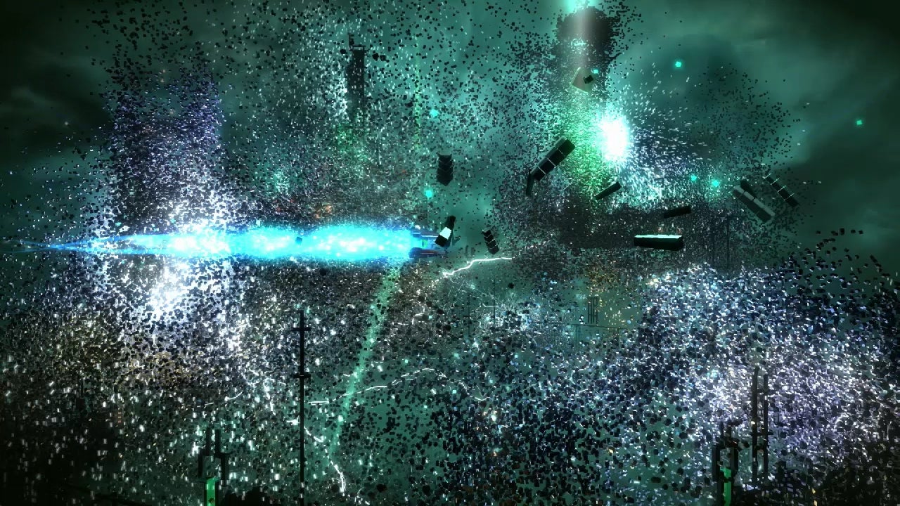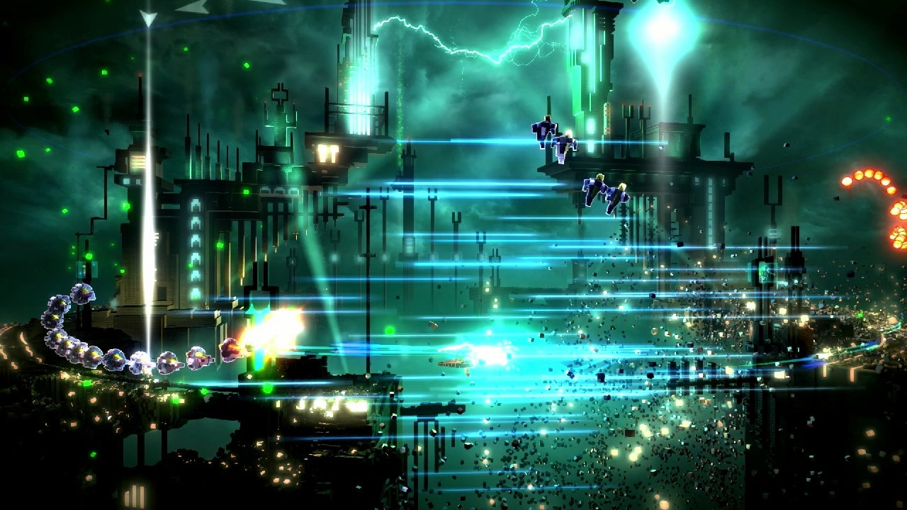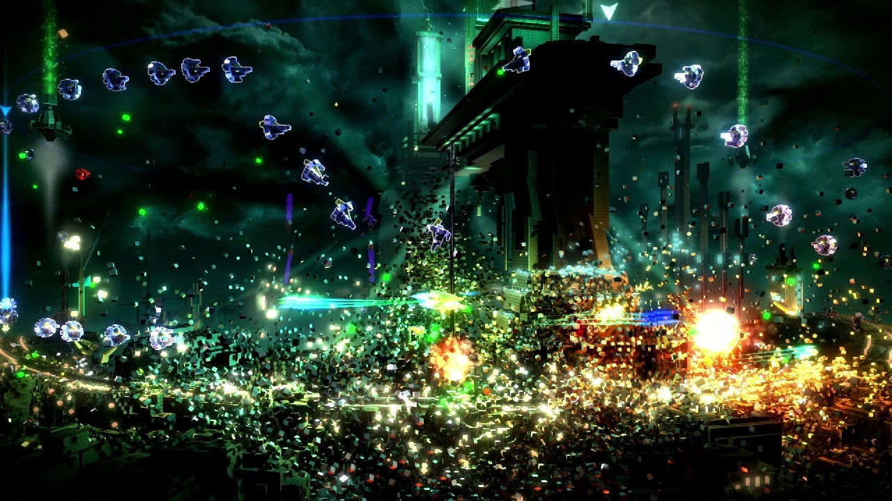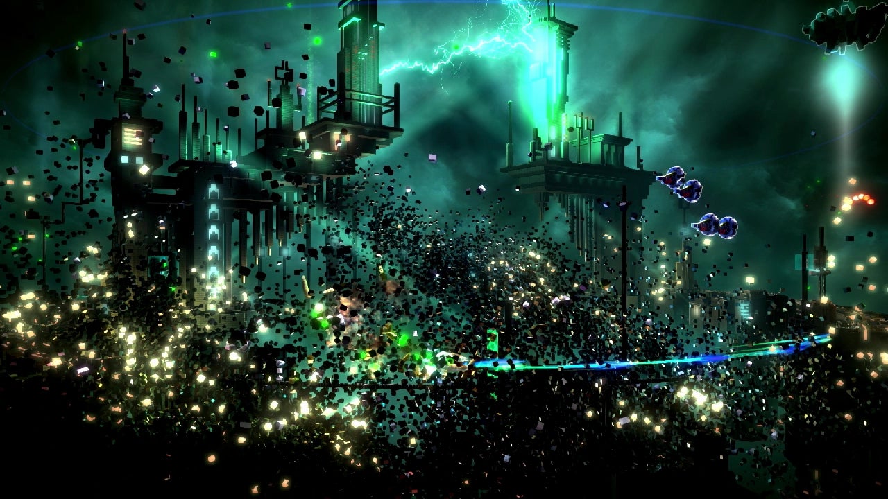 巨大な爆発、敵の波、弾丸の嵐はすべてコースにあり、この開発者に期待される画面いっぱいの花火によって支えられています。デジタル大虐殺を実現する Housemarque のアプローチは興味深いものです。環境は数十万の立方体から作成され、それぞれの立方体が GPU で加速された物理学によって個別にアニメーション化されます。