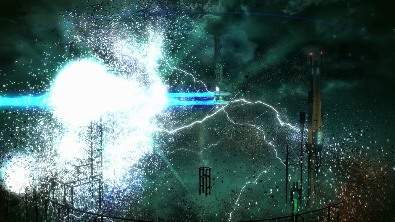私たちの最初の努力はかなり絶望的でしたが、クルーガーが操縦を引き継ぎました。迫りくる敵の波を難なく切り裂き、人間をすくい上げて救助ポイントに降ろし、武器をパワーアップするとき、画面は完全な破壊で生き生きとしています。大地に向かい、砲塔をオーバードライブして進むと、画面が何百ものアニメーション化された立方体で爆発します。私たちの議論が進むにつれ、理論的には数百の光源でシーンを照らすための遅延ライティング システムが導入されたネイティブ 1080p60 が確認されましたが、Housemarque はその使用を驚くほど抑制しています。